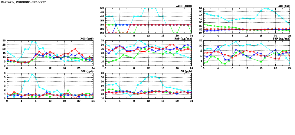 | Air Quality Data Time Series in Eastern (2018/06/21) | ( Line colors: Day -3 Day -2 Day -1 Current day ) | 2D Map Current AQHI |