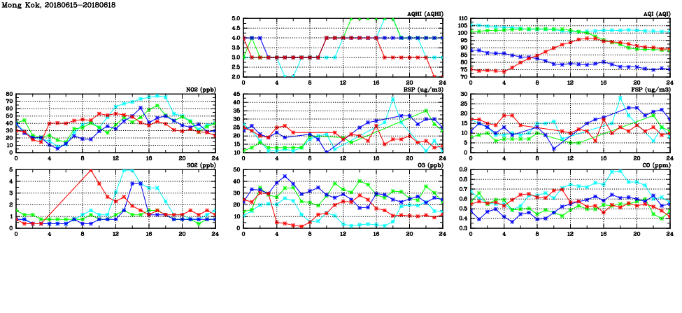 | Air Quality Data Time Series in Mong Kok (2018/06/18) | ( Line colors: Day -3 Day -2 Day -1 Current day ) | 2D Map Current AQHI |