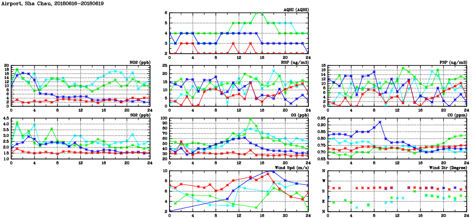 | Air Quality Data Time Series in Airport, Sha Chau (2018/06/19) | ( Line colors: Day -3 Day -2 Day -1 Current day ) | 2D Map Current AQHI |