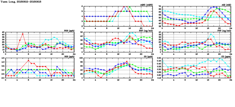 | Air Quality Data Time Series in Yuen Long (2018/06/18) | ( Line colors: Day -3 Day -2 Day -1 Current day ) | 2D Map Current AQHI |
