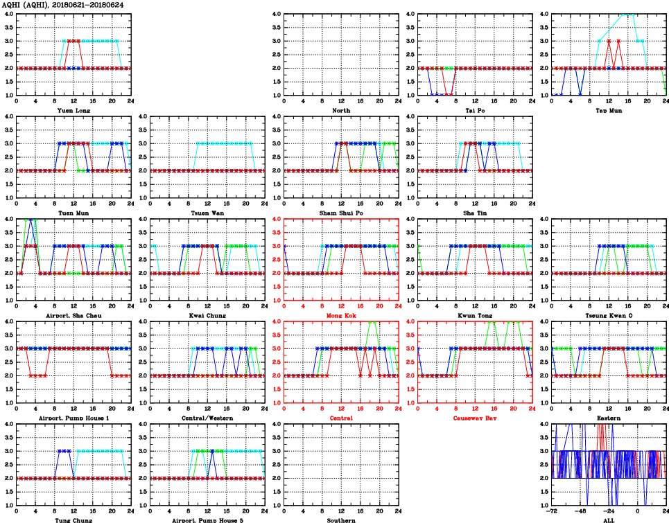 | Air Quality Data Time Series for AQHI (2018/06/24) | ( Line colors: Day -3 Day -2 Day -1 Current day ) | 2D Map Current AQHI |
