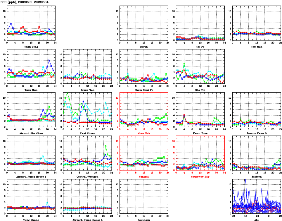 | Air Quality Data Time Series for SO2 (2018/06/24) | ( Line colors: Day -3 Day -2 Day -1 Current day ) | 2D Map Current AQHI |