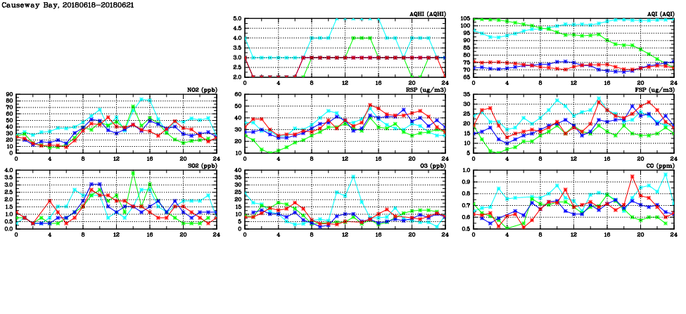 | Air Quality Data Time Series in Causeway Bay (2018/06/21) | ( Line colors: Day -3 Day -2 Day -1 Current day ) | 2D Map Current AQHI |
