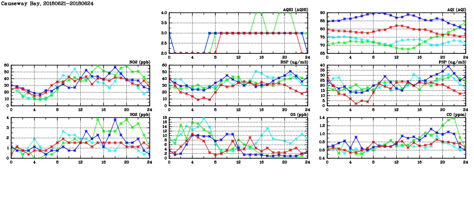 | Air Quality Data Time Series in Causeway Bay (2018/06/24) | ( Line colors: Day -3 Day -2 Day -1 Current day ) | 2D Map Current AQHI |
