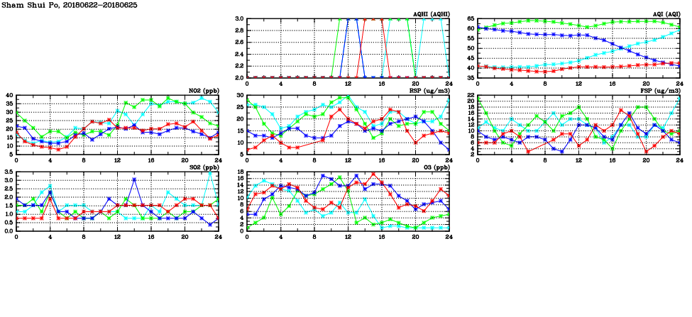 | Air Quality Data Time Series in Sham Shui Po (2018/06/25) | ( Line colors: Day -3 Day -2 Day -1 Current day ) | 2D Map Current AQHI |