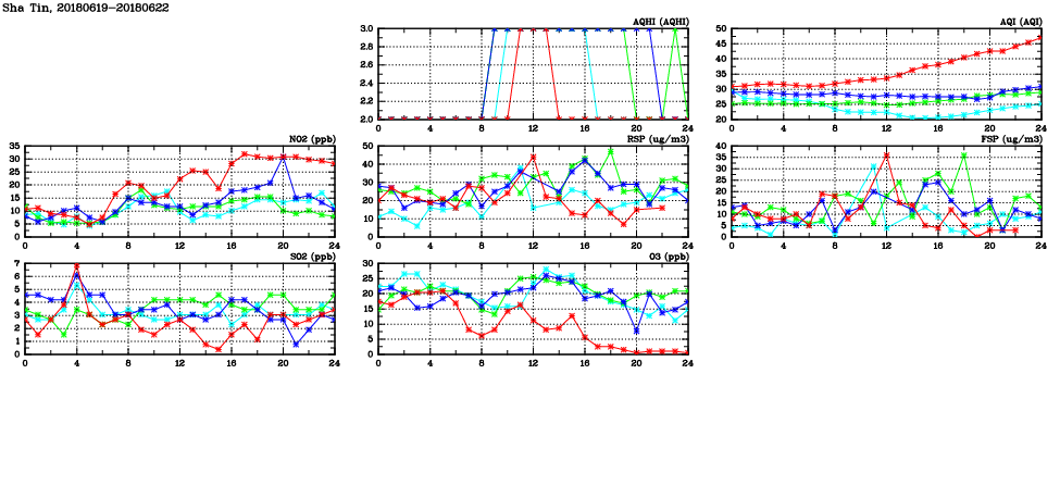 | Air Quality Data Time Series in Sha Tin (2018/06/22) | ( Line colors: Day -3 Day -2 Day -1 Current day ) | 2D Map Current AQHI |