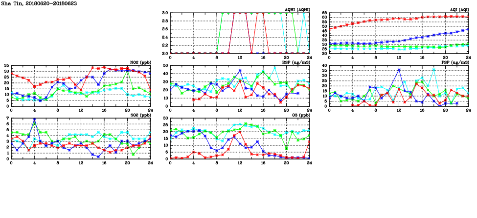 | Air Quality Data Time Series in Sha Tin (2018/06/23) | ( Line colors: Day -3 Day -2 Day -1 Current day ) | 2D Map Current AQHI |