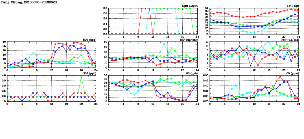 | Air Quality Data Time Series in Tung Chung (2018/06/23) | ( Line colors: Day -3 Day -2 Day -1 Current day ) | 2D Map Current AQHI |