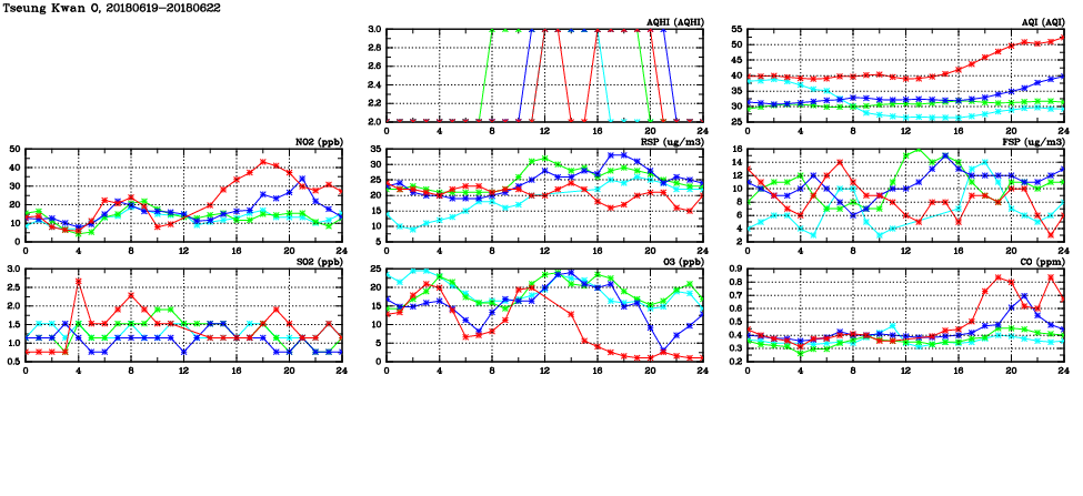 | Air Quality Data Time Series in Tseung Kwan O (2018/06/22) | ( Line colors: Day -3 Day -2 Day -1 Current day ) | 2D Map Current AQHI |