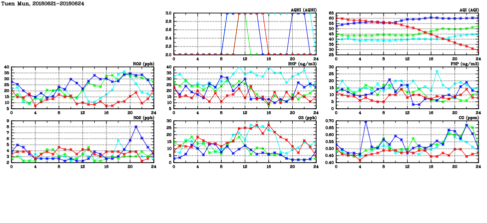 | Air Quality Data Time Series in Tuen Mun (2018/06/24) | ( Line colors: Day -3 Day -2 Day -1 Current day ) | 2D Map Current AQHI |