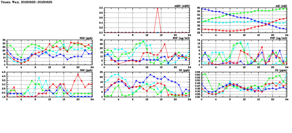| Air Quality Data Time Series in Tsuen Wan (2018/06/25) | ( Line colors: Day -3 Day -2 Day -1 Current day ) | 2D Map Current AQHI |
