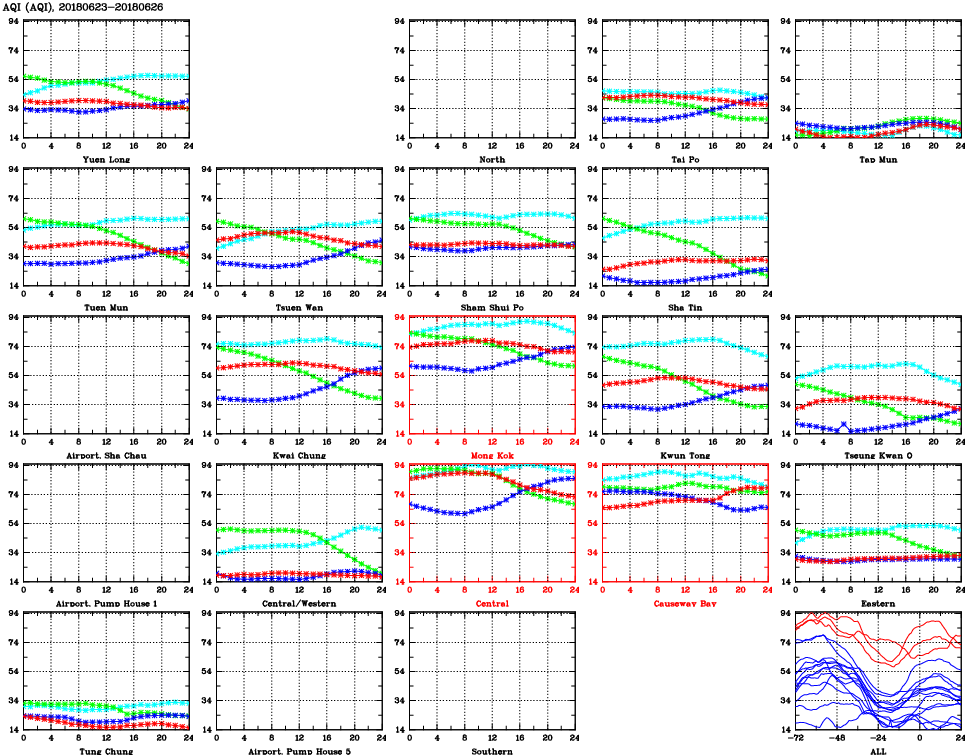 | Air Quality Data Time Series for AQI (2018/06/26) | ( Line colors: Day -3 Day -2 Day -1 Current day ) | 2D Map Current AQHI |