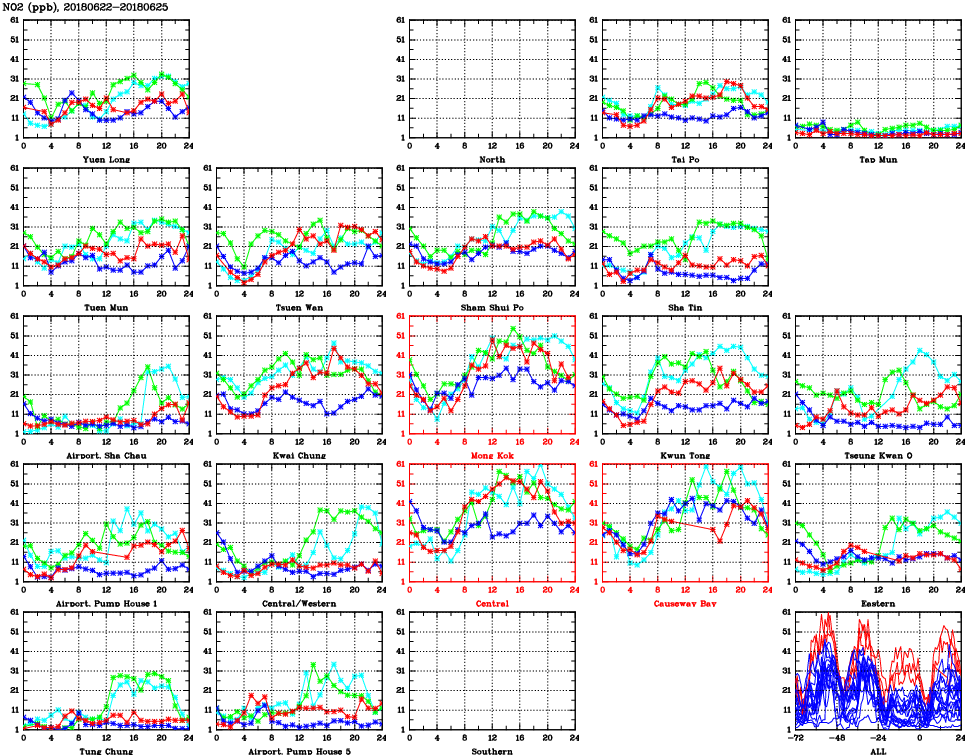 | Air Quality Data Time Series for NO2 (2018/06/25) | ( Line colors: Day -3 Day -2 Day -1 Current day ) | 2D Map Current AQHI |