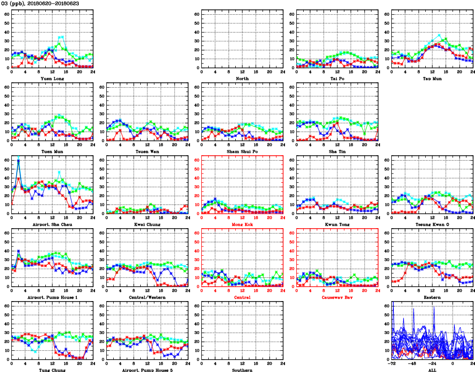| Air Quality Data Time Series for O3 (2018/06/23) | ( Line colors: Day -3 Day -2 Day -1 Current day ) | 2D Map Current AQHI |