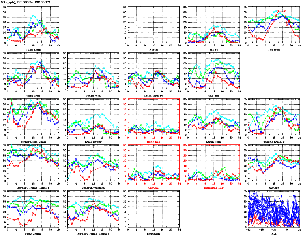 | Air Quality Data Time Series for O3 (2018/06/27) | ( Line colors: Day -3 Day -2 Day -1 Current day ) | 2D Map Current AQHI |