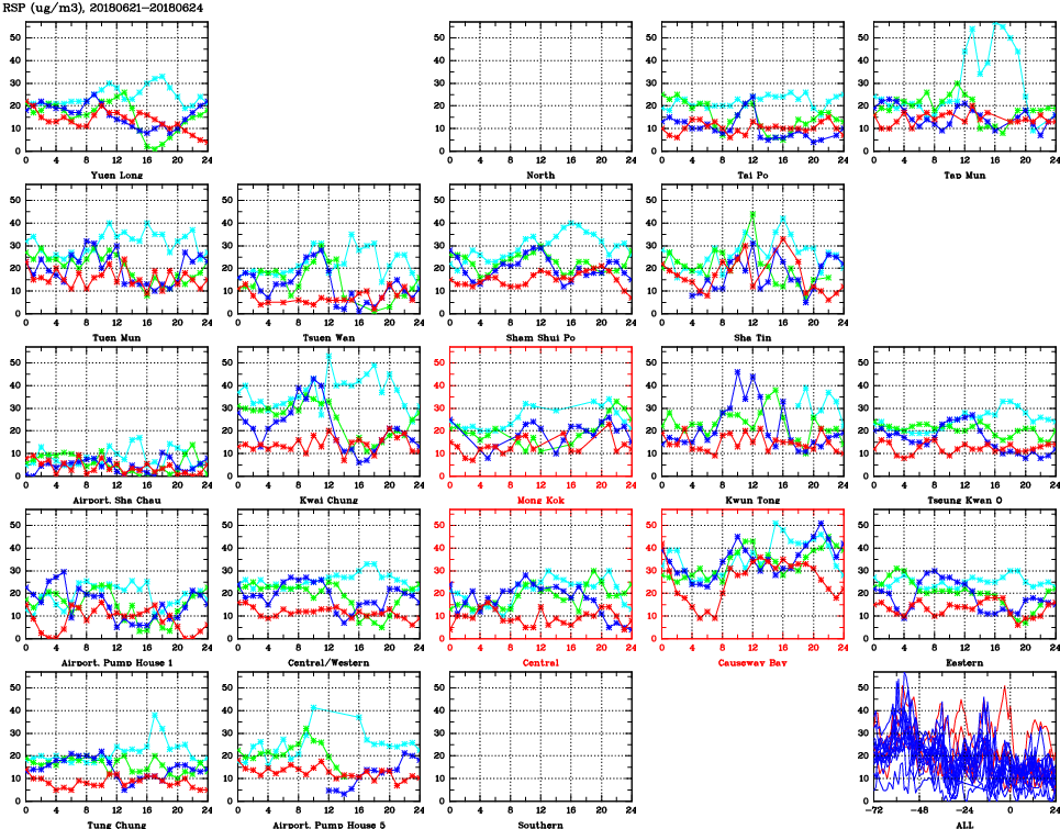 | Air Quality Data Time Series for RSP (2018/06/24) | ( Line colors: Day -3 Day -2 Day -1 Current day ) | 2D Map Current AQHI |