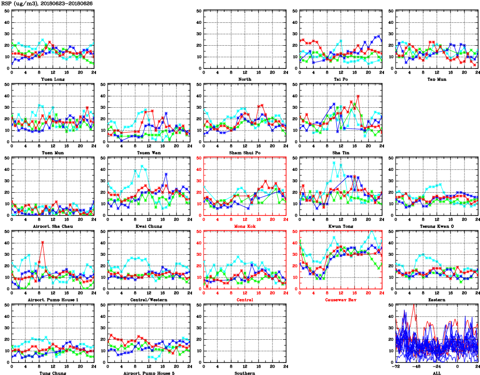 | Air Quality Data Time Series for RSP (2018/06/26) | ( Line colors: Day -3 Day -2 Day -1 Current day ) | 2D Map Current AQHI |