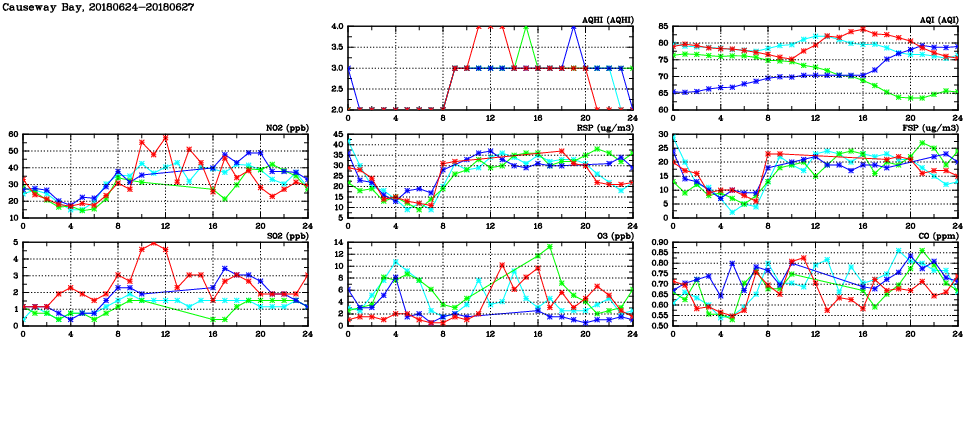 | Air Quality Data Time Series in Causeway Bay (2018/06/27) | ( Line colors: Day -3 Day -2 Day -1 Current day ) | 2D Map Current AQHI |