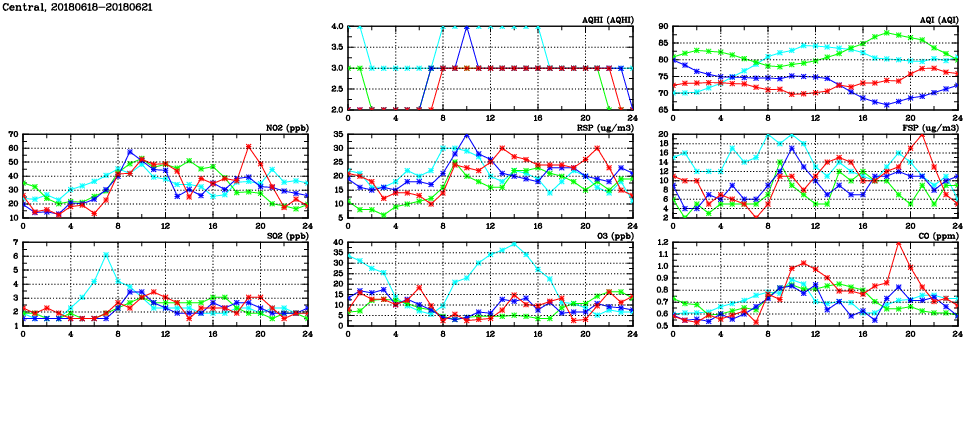 | Air Quality Data Time Series in Central (2018/06/21) | ( Line colors: Day -3 Day -2 Day -1 Current day ) | 2D Map Current AQHI |