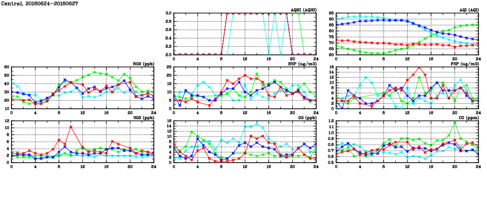 | Air Quality Data Time Series in Central (2018/06/27) | ( Line colors: Day -3 Day -2 Day -1 Current day ) | 2D Map Current AQHI |