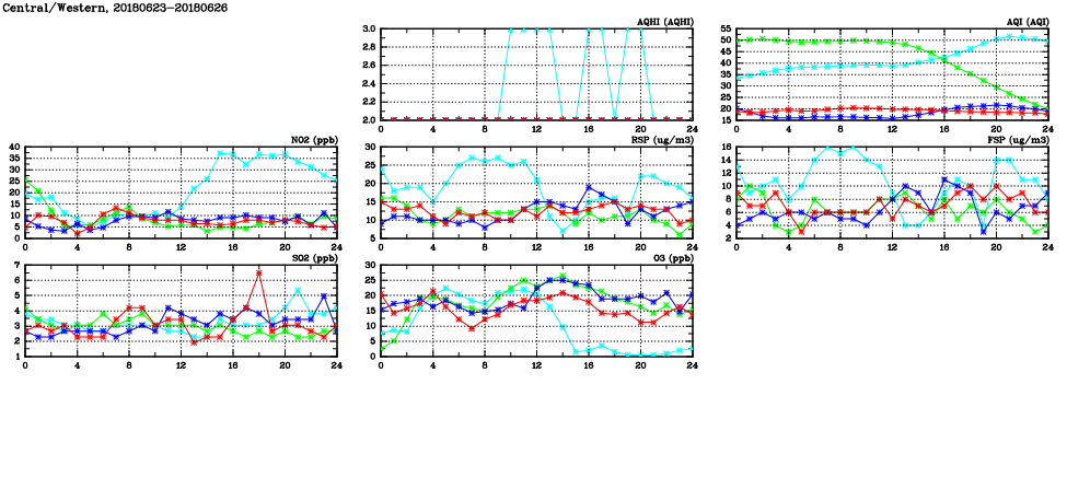 | Air Quality Data Time Series in Central/Western (2018/06/26) | ( Line colors: Day -3 Day -2 Day -1 Current day ) | 2D Map Current AQHI |
