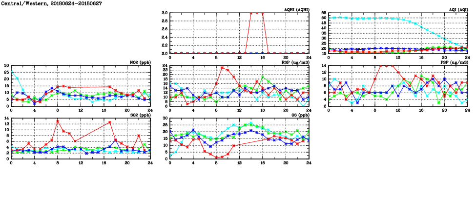| Air Quality Data Time Series in Central/Western (2018/06/27) | ( Line colors: Day -3 Day -2 Day -1 Current day ) | 2D Map Current AQHI |