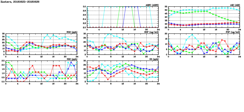 | Air Quality Data Time Series in Eastern (2018/06/26) | ( Line colors: Day -3 Day -2 Day -1 Current day ) | 2D Map Current AQHI |