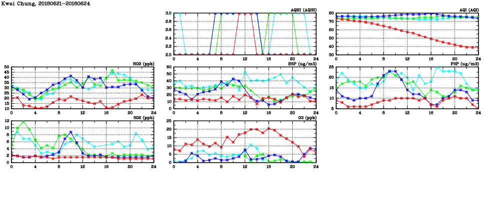| Air Quality Data Time Series in Kwai Chung (2018/06/24) | ( Line colors: Day -3 Day -2 Day -1 Current day ) | 2D Map Current AQHI |