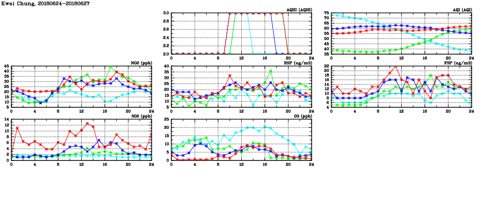 | Air Quality Data Time Series in Kwai Chung (2018/06/27) | ( Line colors: Day -3 Day -2 Day -1 Current day ) | 2D Map Current AQHI |
