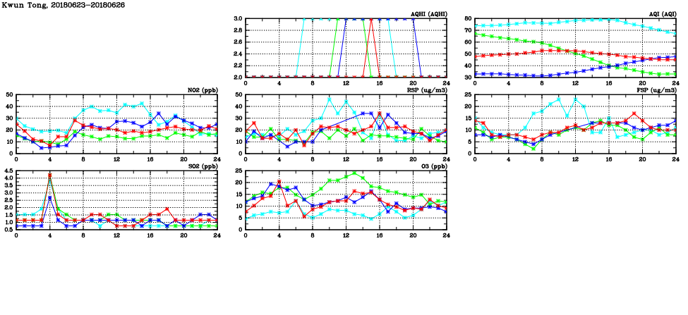 | Air Quality Data Time Series in Kwun Tong (2018/06/26) | ( Line colors: Day -3 Day -2 Day -1 Current day ) | 2D Map Current AQHI |