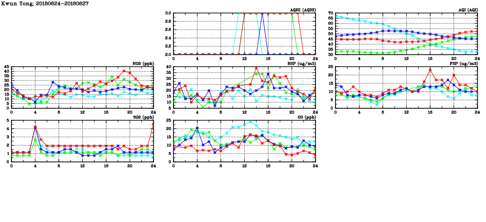 | Air Quality Data Time Series in Kwun Tong (2018/06/27) | ( Line colors: Day -3 Day -2 Day -1 Current day ) | 2D Map Current AQHI |