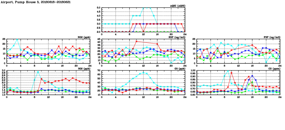 | Air Quality Data Time Series in Airport, Pump House 5 (2018/06/21) | ( Line colors: Day -3 Day -2 Day -1 Current day ) | 2D Map Current AQHI |
