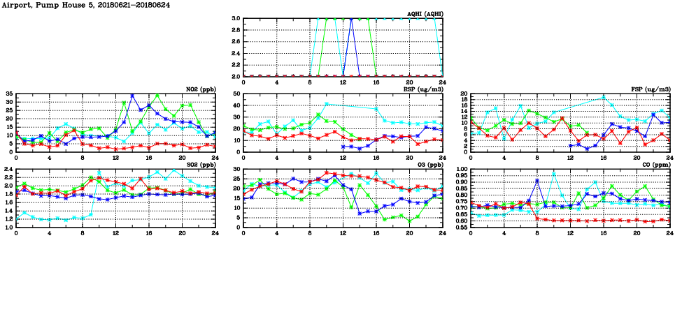 | Air Quality Data Time Series in Airport, Pump House 5 (2018/06/24) | ( Line colors: Day -3 Day -2 Day -1 Current day ) | 2D Map Current AQHI |