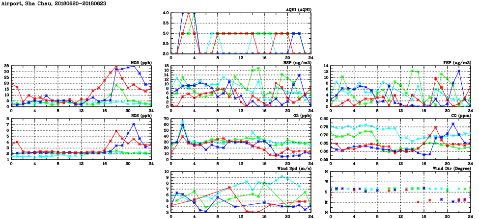 | Air Quality Data Time Series in Airport, Sha Chau (2018/06/23) | ( Line colors: Day -3 Day -2 Day -1 Current day ) | 2D Map Current AQHI |
