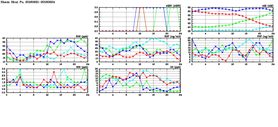 | Air Quality Data Time Series in Sham Shui Po (2018/06/24) | ( Line colors: Day -3 Day -2 Day -1 Current day ) | 2D Map Current AQHI |