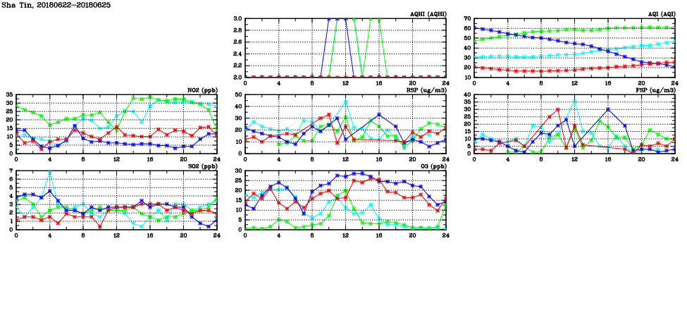 | Air Quality Data Time Series in Sha Tin (2018/06/25) | ( Line colors: Day -3 Day -2 Day -1 Current day ) | 2D Map Current AQHI |