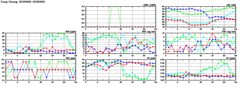 | Air Quality Data Time Series in Tung Chung (2018/06/25) | ( Line colors: Day -3 Day -2 Day -1 Current day ) | 2D Map Current AQHI |