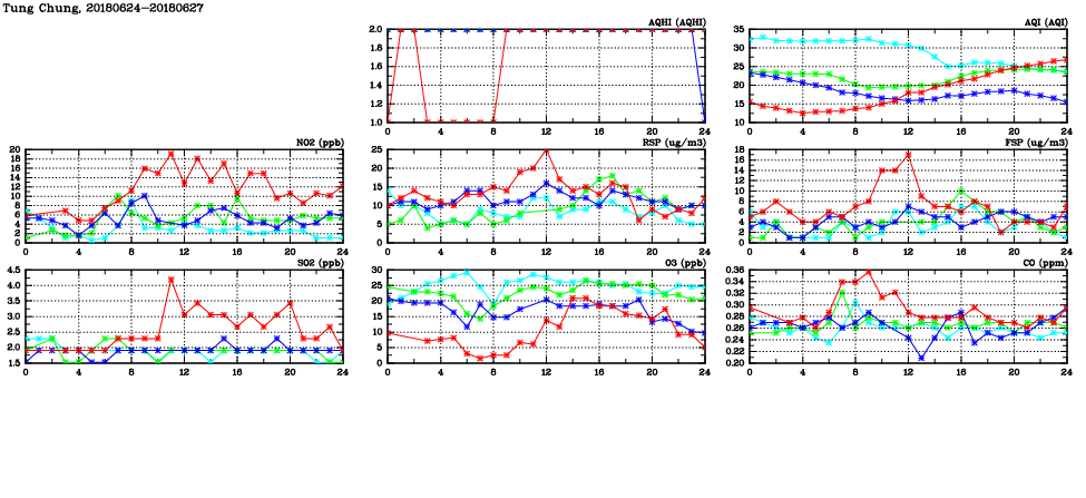 | Air Quality Data Time Series in Tung Chung (2018/06/27) | ( Line colors: Day -3 Day -2 Day -1 Current day ) | 2D Map Current AQHI |