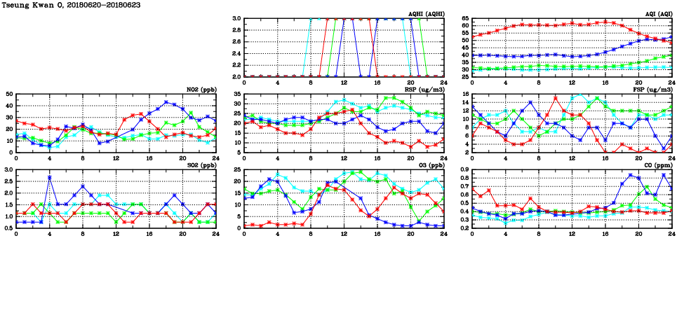 | Air Quality Data Time Series in Tseung Kwan O (2018/06/23) | ( Line colors: Day -3 Day -2 Day -1 Current day ) | 2D Map Current AQHI |