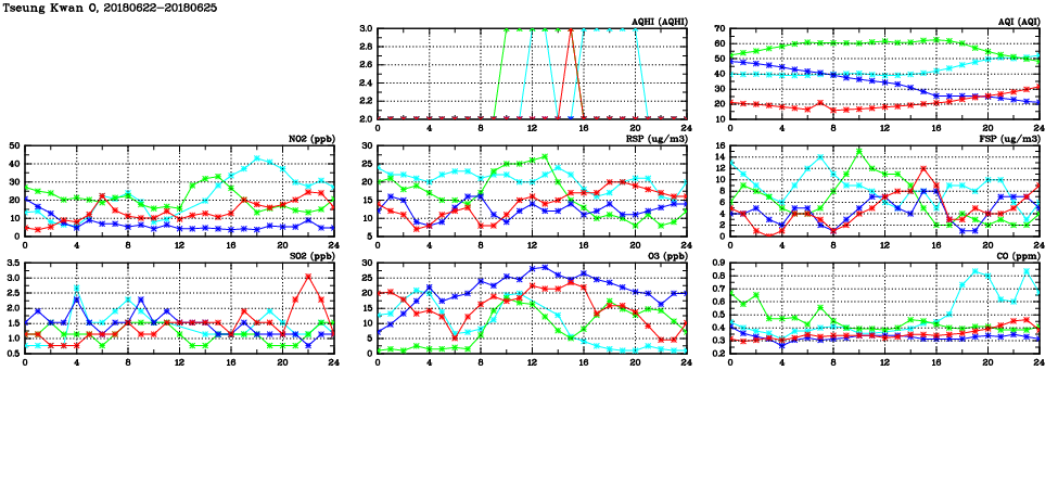 | Air Quality Data Time Series in Tseung Kwan O (2018/06/25) | ( Line colors: Day -3 Day -2 Day -1 Current day ) | 2D Map Current AQHI |