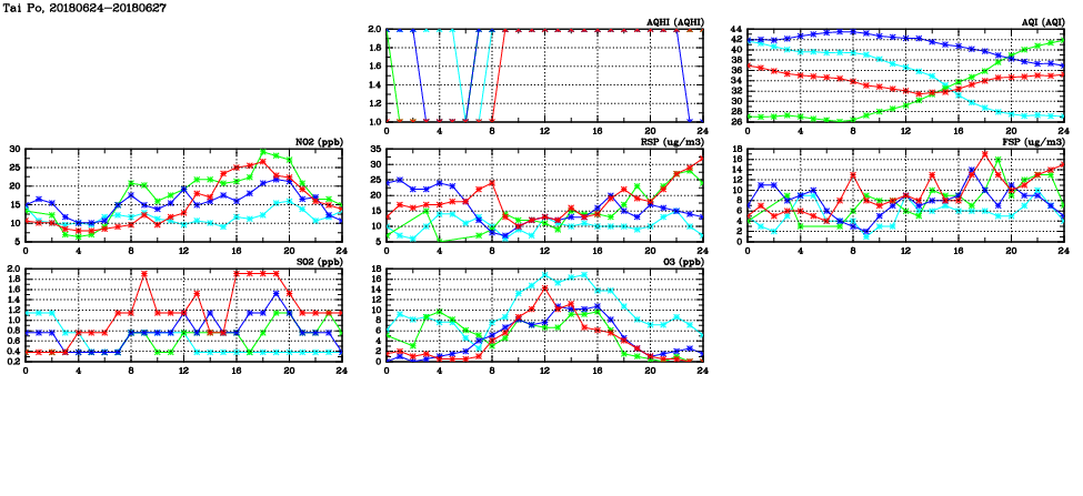 | Air Quality Data Time Series in Tai Po (2018/06/27) | ( Line colors: Day -3 Day -2 Day -1 Current day ) | 2D Map Current AQHI |