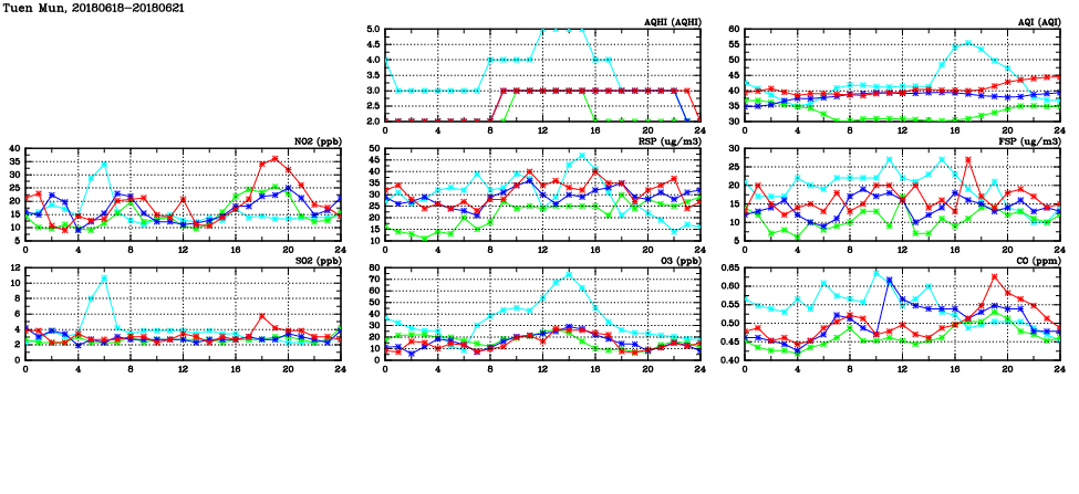 | Air Quality Data Time Series in Tuen Mun (2018/06/21) | ( Line colors: Day -3 Day -2 Day -1 Current day ) | 2D Map Current AQHI |