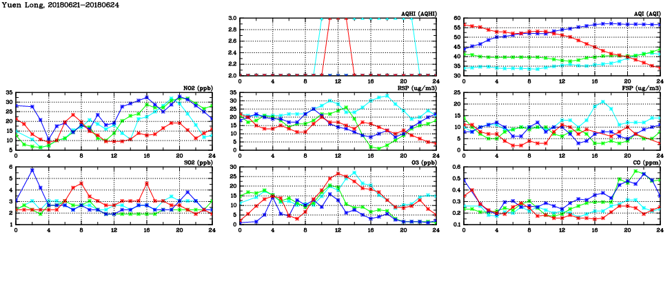 | Air Quality Data Time Series in Yuen Long (2018/06/24) | ( Line colors: Day -3 Day -2 Day -1 Current day ) | 2D Map Current AQHI |