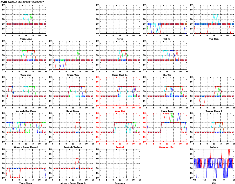 | Air Quality Data Time Series for AQHI (2018/06/27) | ( Line colors: Day -3 Day -2 Day -1 Current day ) | 2D Map Current AQHI |