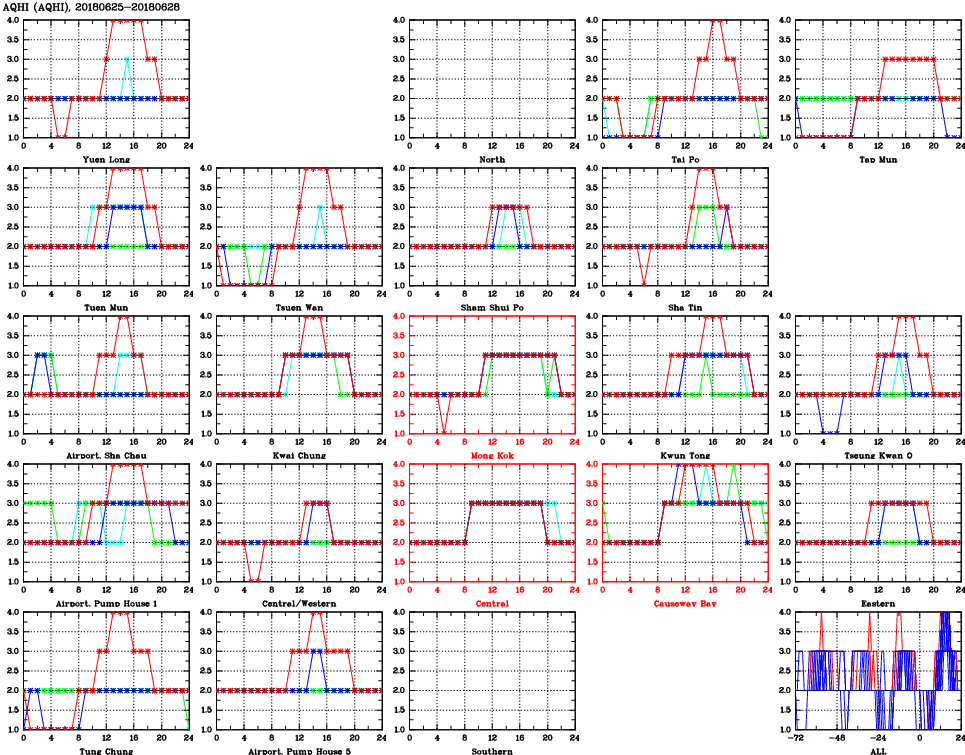 | Air Quality Data Time Series for AQHI (2018/06/28) | ( Line colors: Day -3 Day -2 Day -1 Current day ) | 2D Map Current AQHI |