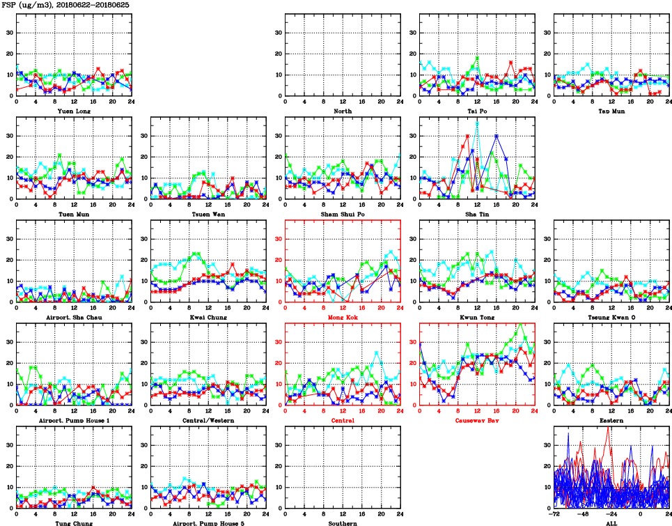 | Air Quality Data Time Series for FSP (2018/06/25) | ( Line colors: Day -3 Day -2 Day -1 Current day ) | 2D Map Current AQHI |