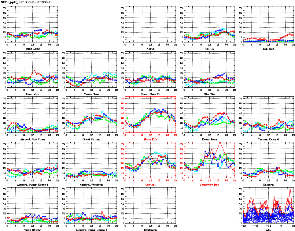 | Air Quality Data Time Series for NO2 (2018/06/28) | ( Line colors: Day -3 Day -2 Day -1 Current day ) | 2D Map Current AQHI |