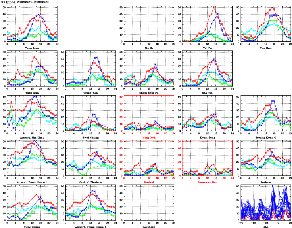 | Air Quality Data Time Series for O3 (2018/06/29) | ( Line colors: Day -3 Day -2 Day -1 Current day ) | 2D Map Current AQHI |