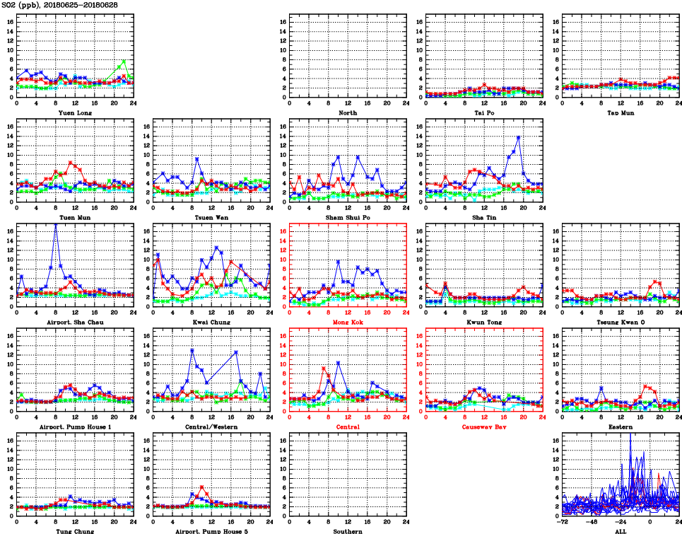 | Air Quality Data Time Series for SO2 (2018/06/28) | ( Line colors: Day -3 Day -2 Day -1 Current day ) | 2D Map Current AQHI |