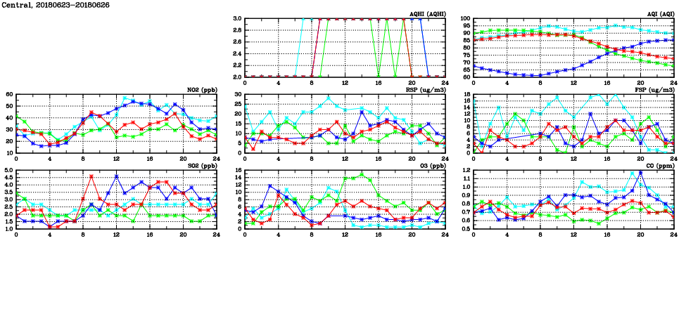 | Air Quality Data Time Series in Central (2018/06/26) | ( Line colors: Day -3 Day -2 Day -1 Current day ) | 2D Map Current AQHI |